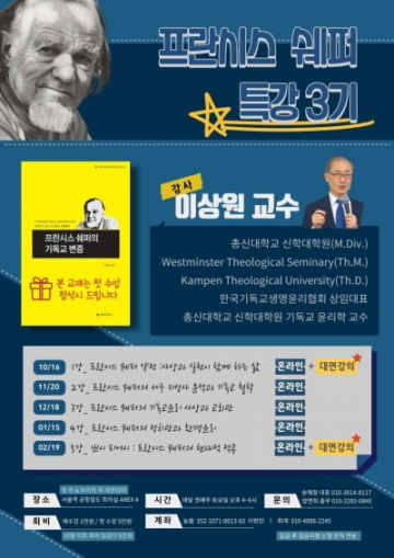 일정은 다음과 같다. △10월 16일 제1강 ‘프란시스 쉐퍼 약전: 사상과 실천이 함께 하는 삶’ △11월 20일 제2강 ‘프란시스 쉐퍼의 서구 지성사 분석과 기독교 철학’ △12월 18일 제3강 ‘프란시스 쉐퍼의 기독교윤리 사상과 교회관’ △2022년 1월 15일 제4강 ‘프란시스 쉐퍼의 정치관과 환경윤리’ △2022년 2월 19일 제5강 ‘낸시 피어시: 프란시스 쉐퍼의 현대적 적용’.